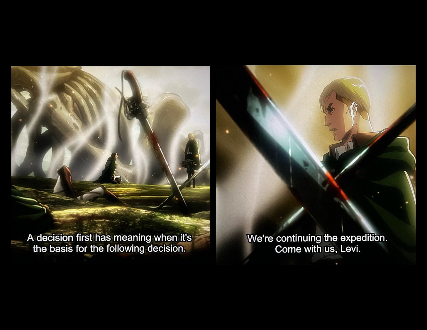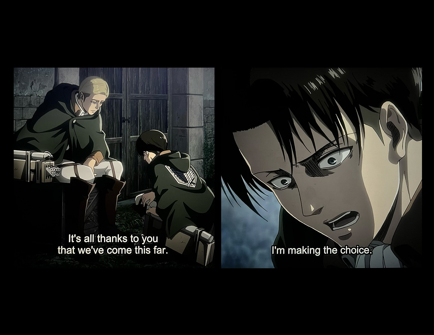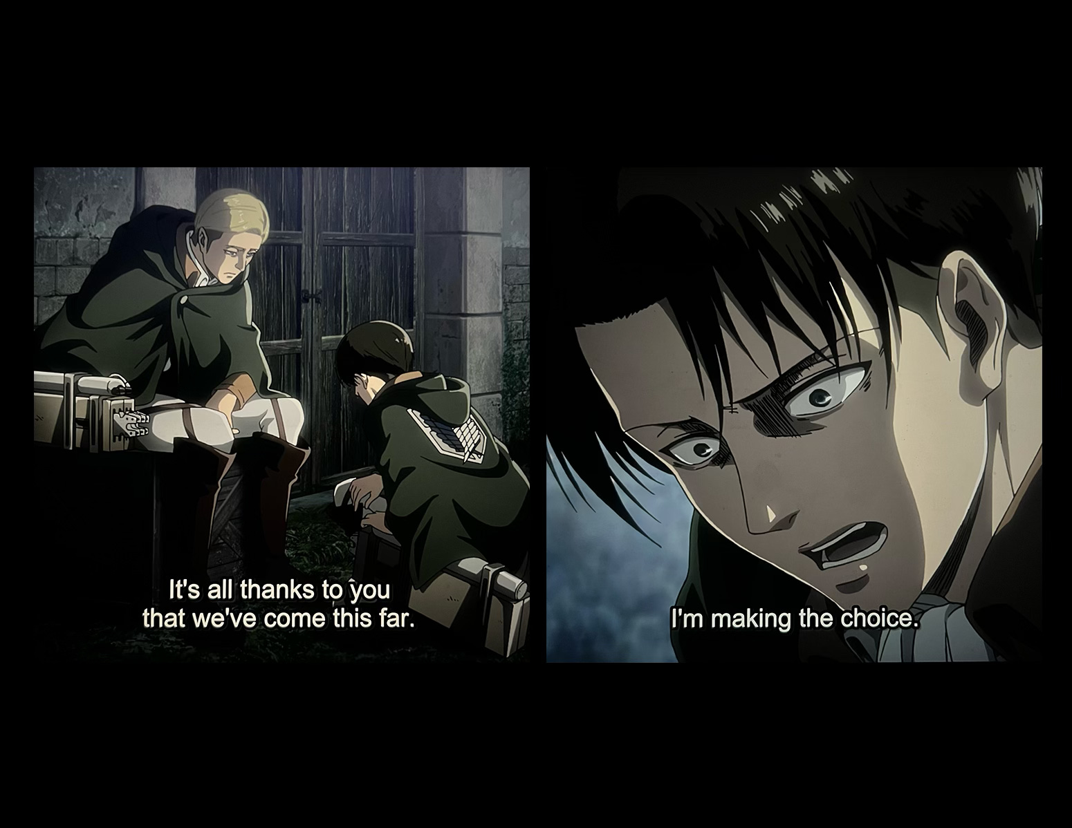 This is where we witness the reason why Levi chooses to stay alive and continue living with a new purpose. He chooses to come with Erwin. He chooses to follow him and move forward.