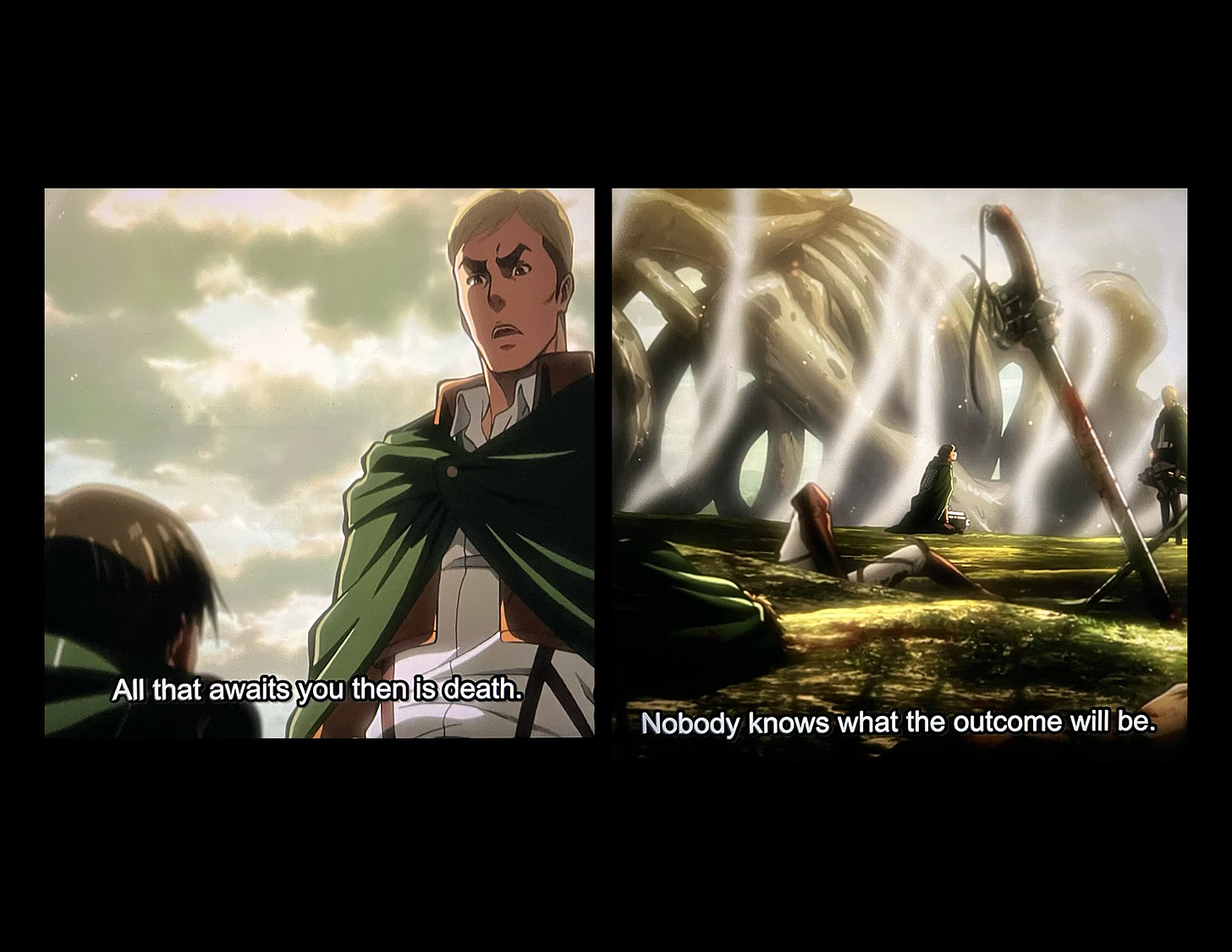The scouts are engaging in a battle that seems more hopeless by the minute. Faced with that fact, Erwin and Levi discuss their strategy. The tables have turned. Erwin is full of doubts and confesses this to Levi.